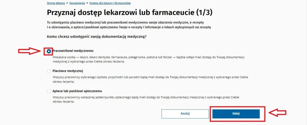 5. W sekcji “Przyznaj dostęp lekarzowi lub farmaceucie (1/3)” zaznacz, że chcesz udostępnić swoją dokumentację medyczną Pracownikowi medycznemu