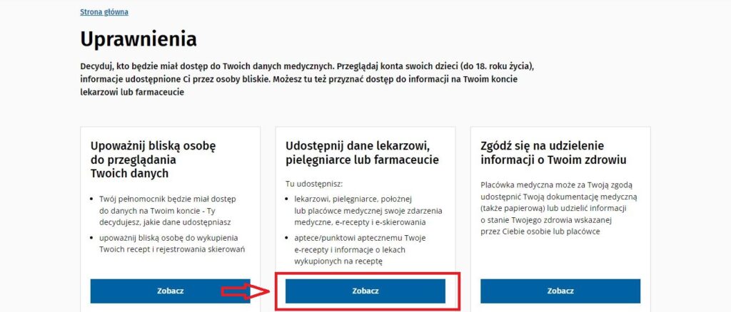 3. Następnie kliknij “Zobacz” w sekcji “Udostępnij dane lekarzowi, pielęgniarce lub farmaceucie”