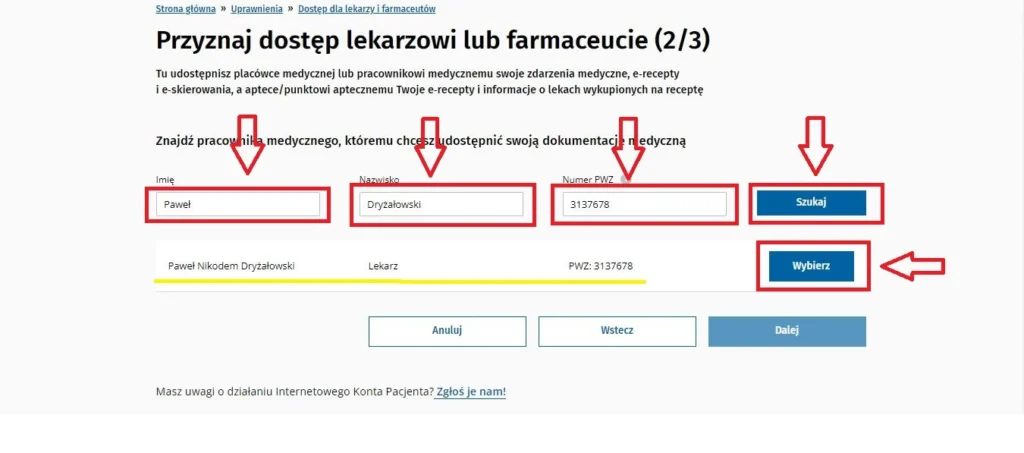 6. W okienkach zaznaczonych poniżej uzupełnij odpowiednie pola wpisując imię, nazwisko oraz numer PWZ lekarza u którego masz wizytę, a następnie kliknij Szukaj.